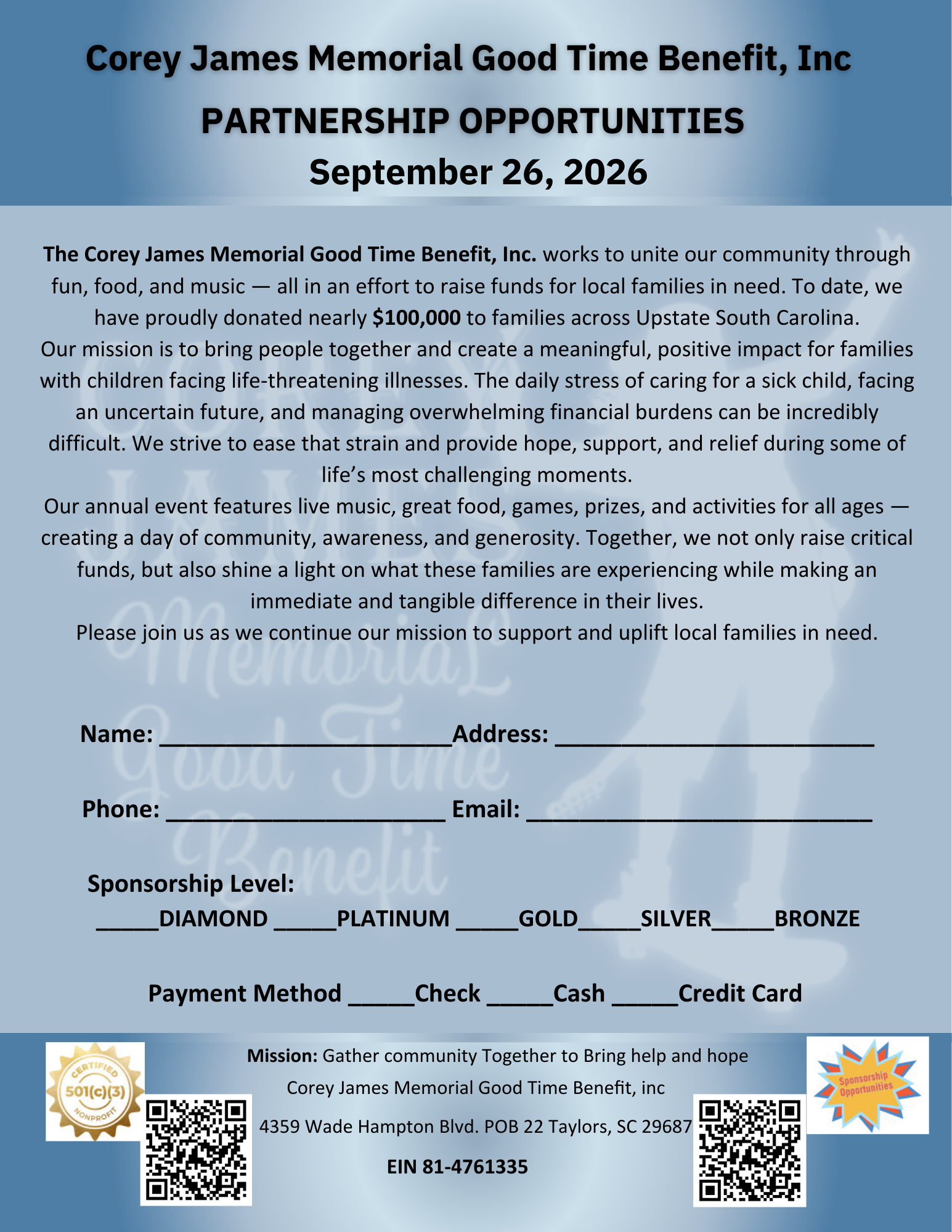 The Corey James Memorial Good Time Benefit, Inc, works to unite together through fun, food, and music — all in an effort to raise funds for local families in need. To date, we have proudly donated nearly $100,000 to families across the Upstate South Carolina.